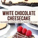 Sometimes white chocolate can be too sweet, but I find this white chocolate cheesecake is perfect because the tanginess of the cream cheese really balances out the sweetness of the chocolate. Then the Oreo cookie crust and chocolate ganache topping are the perfect complements to the white chocolate flavor. I’m not a huge fan of using superlatives but I’ve been told “this is the best cheesecake I’ve ever eaten.”